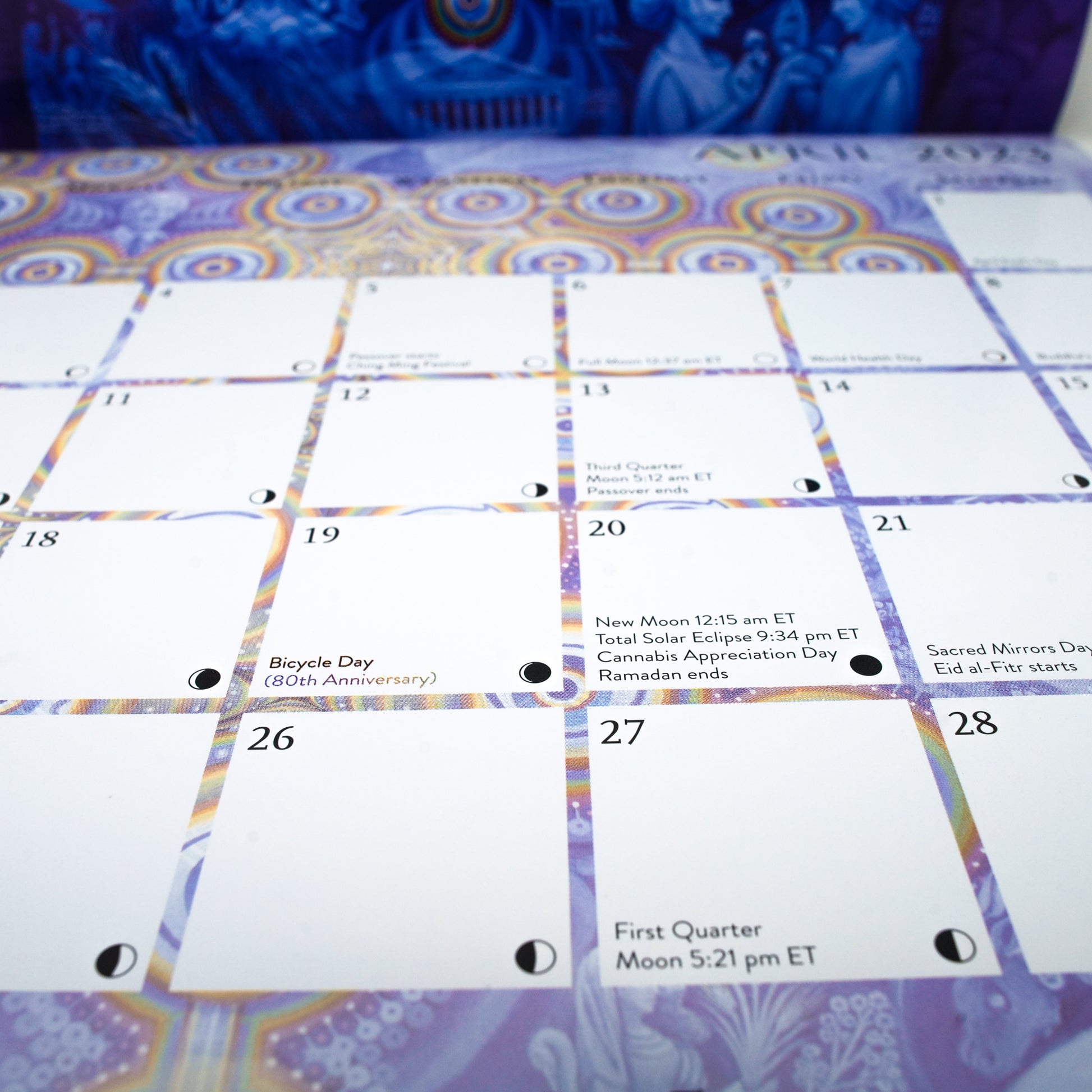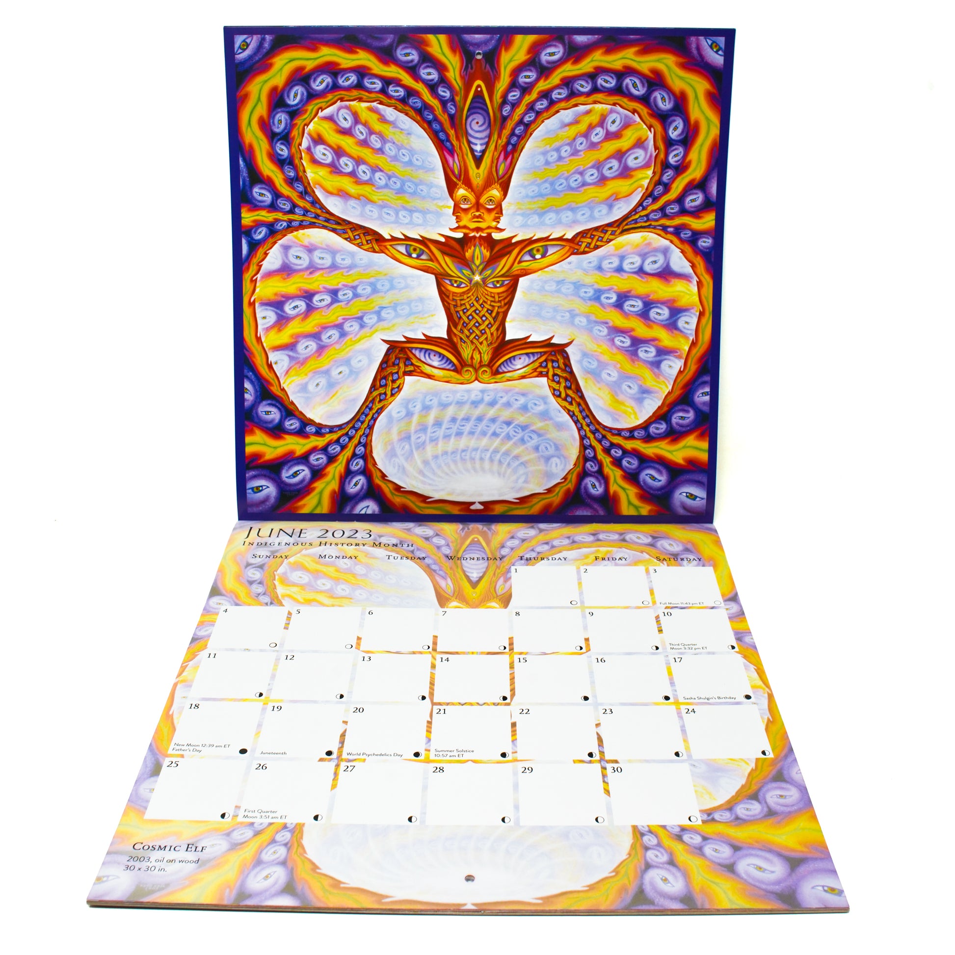 A 2023 Visionary Art calendar featuring the work of Alex Grey. Offers a variety of innovative and traditional holidays and holy days, as well as the phases of the moon, the wheel of the year, and the birthdays of psychedelic heroes.