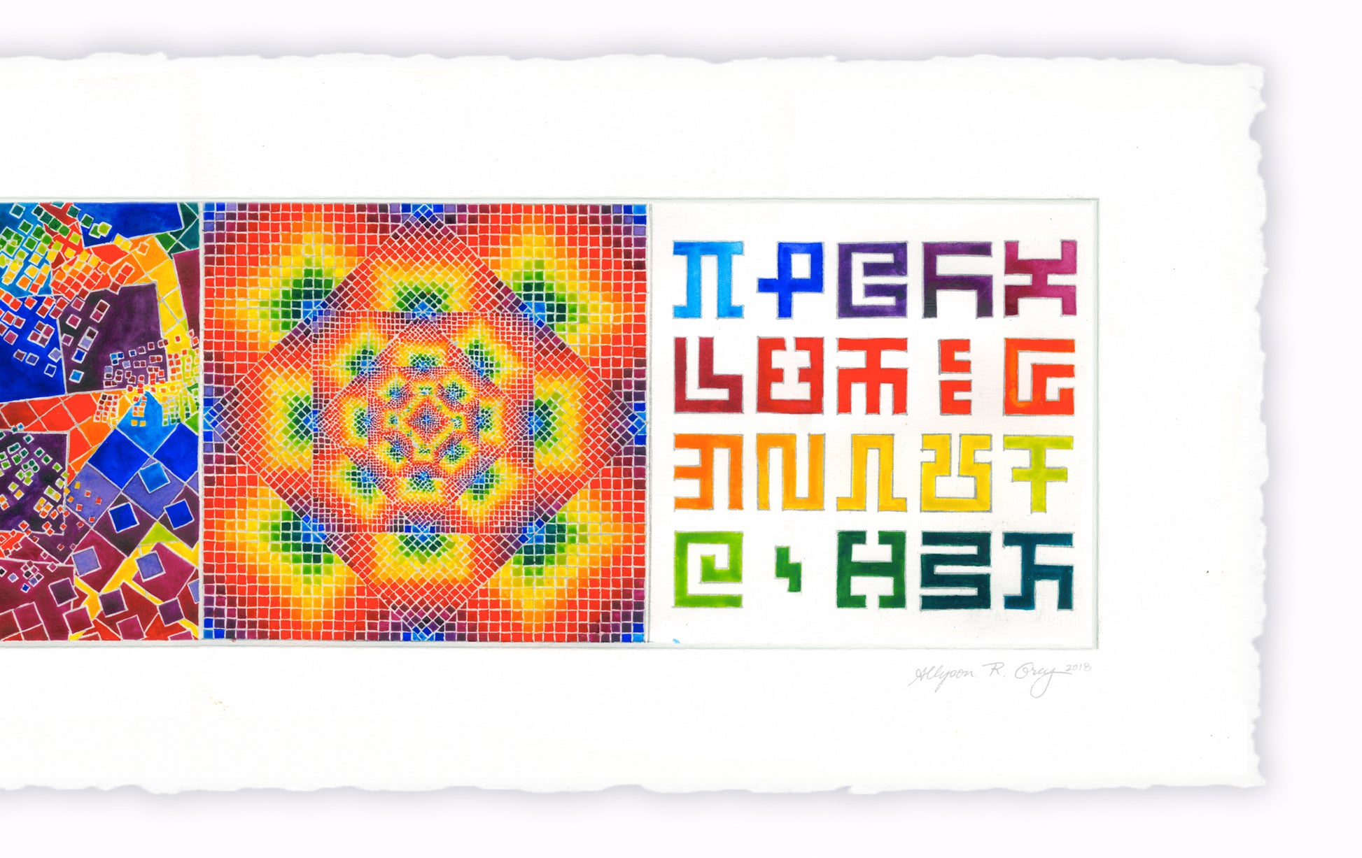 Chaos, Order, and Secret Writing portray symbols of the artists essentialized world view: Chaos symbolizes the material world of entropy, disorder and unpredictability existent in every system in the physical world.