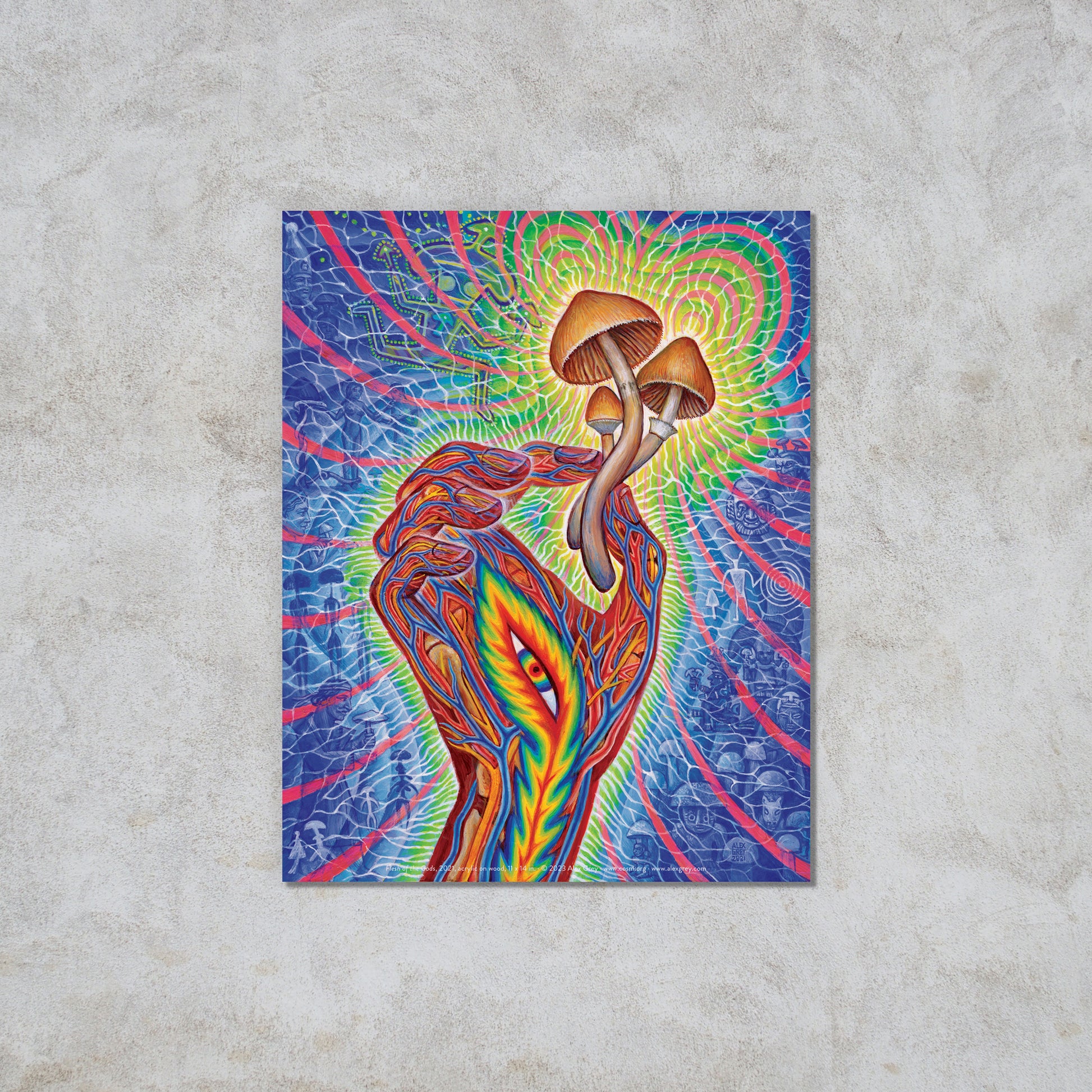 The secrets of spirituality are not only hidden in words, pictures or temples built by humans, but have been safely guarded by sacred plants for millennia. The term “flesh of the Gods" is a translation of Teonanacatl, the Mexican term for psilocybin mushrooms and describes the magic of the psychedelic state. Eat and become mystically united with infinite Divine Intelligence, only to be ingested in the most sacred way. The ancient shamanic and religious use of plant sacraments is now being recognized as foundational to religion, art and philosophy. In my painting the hand holds a few consciousness altering fungi as selected scenes from art history highlight mushroom visionary culture. On the left side of the hand an Egyptian bust of Osiris may show a mushroom cap, a Hindu deity sprouts a mushroom head, an 8,000 year old Tasilli cave art mushroom headed running figure carries mushrooms, a French depiction of Adam & Eve munching mushrooms, the Greek Goddess Demeter holding a mushroom, mushroom headed beings from Spanish cave art, and a figure bestowing a mushroom during a Zoroastrian Soma ceremony from a 2000 year old burial shroud found on the Silk Road. On the right side of the flaming eye hand are references to the mushroom showing art from Hawaian, Peruvian, Guatemalan, Mexican and Native American sources. The ubiquitous presence and use of magic mushrooms from around the world revealed by ancient art, shows humanity’s long, deep and ongoing connection with Great Spirit through psychedelic sacrament.