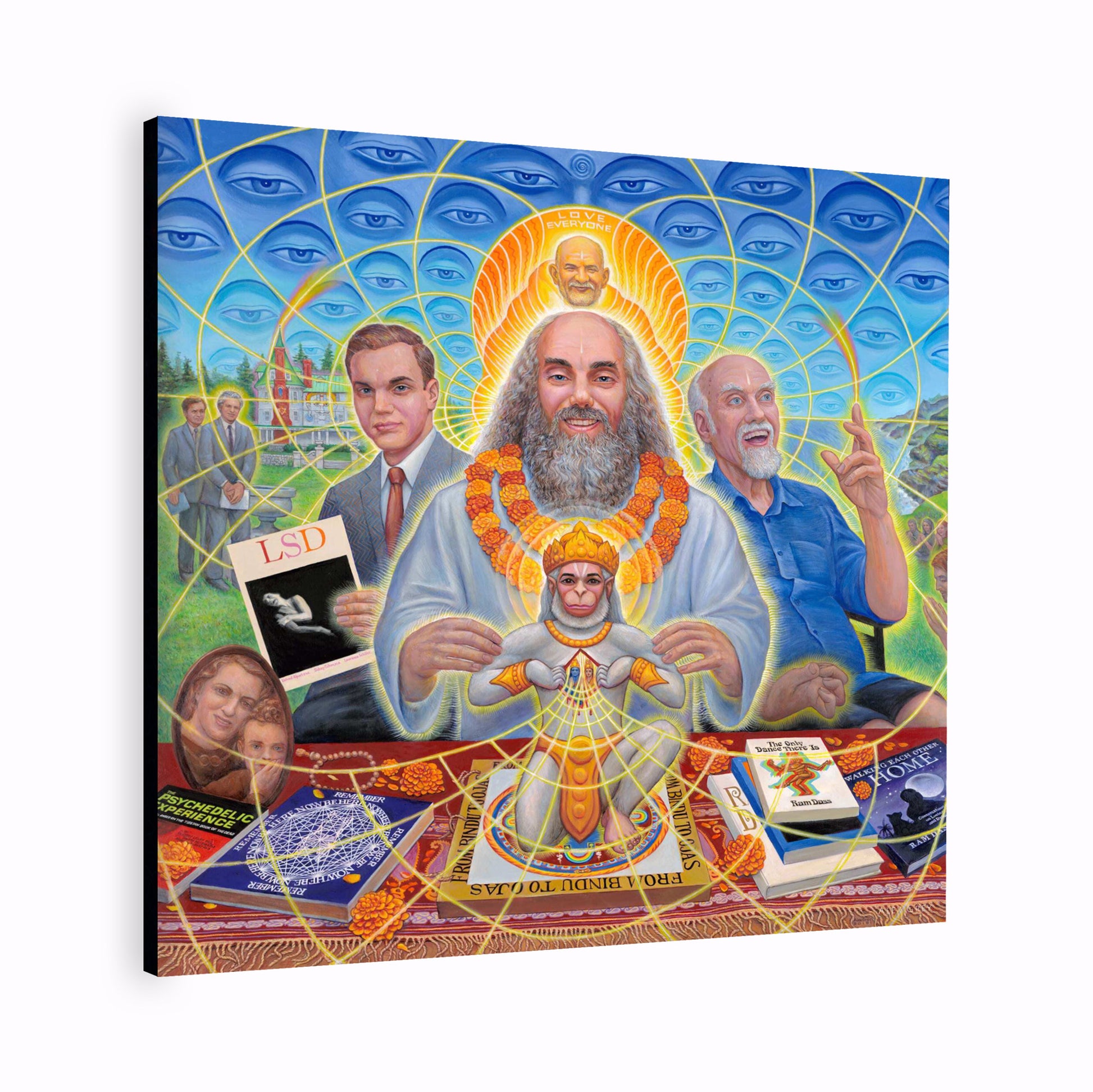 On December 22 beloved Ram Dass transitioned out of his body. Sending love to the great teacher who has had such a profoundly positive impact on the spiritual lives of so many. Behind and in the halo of the central portrait is Maharaji, Neem Karoli Baba, pulling the lightstrings, passing them through the heart of Ram Dass out through Hanuman's chest to serve the world. Did you know that one of the good things Ram Dass helped found was “Seva” an organization helping cure blindness in Asia, the eyes in the sky of my painting refer to that organization.