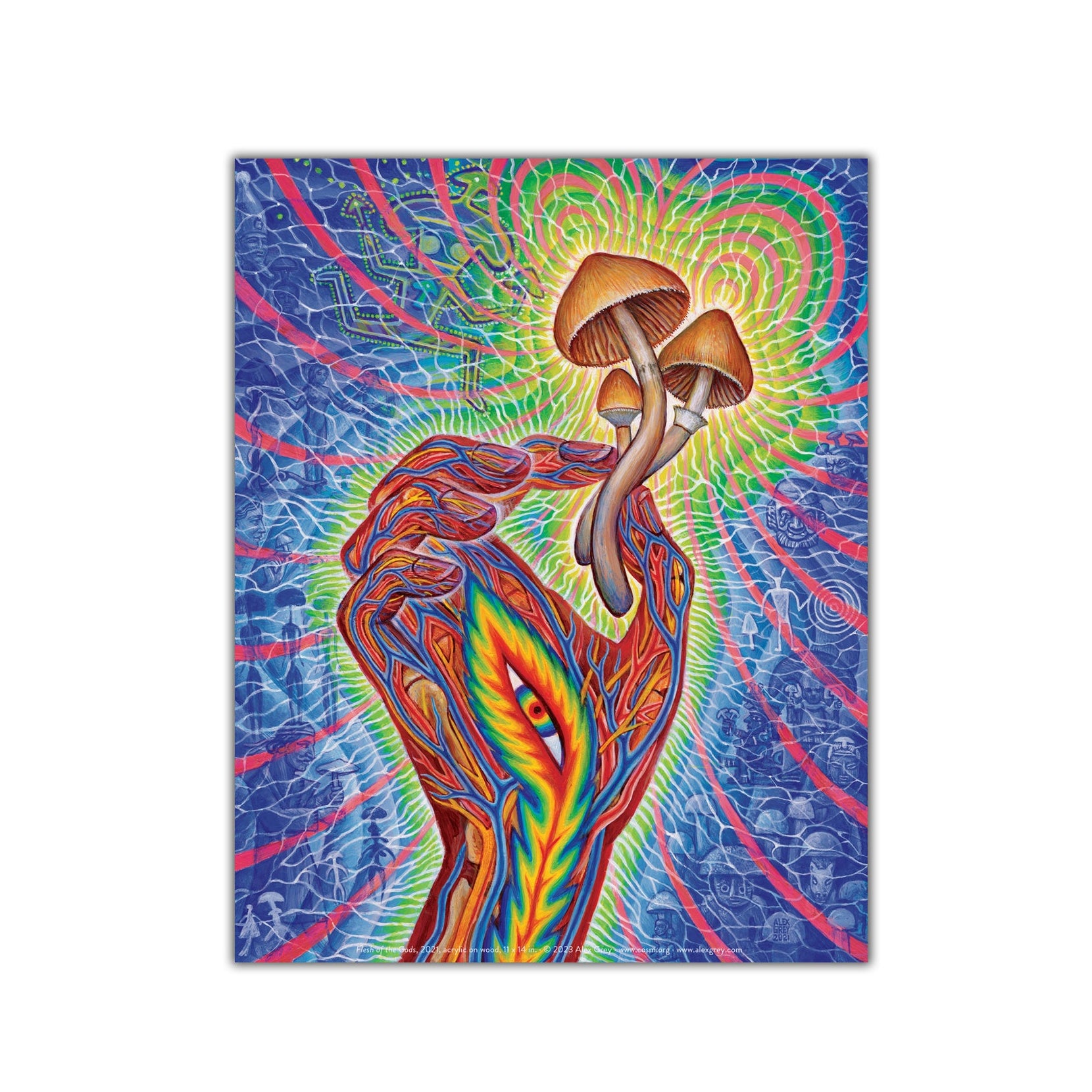 The secrets of spirituality are not only hidden in words, pictures or temples built by humans, but have been safely guarded by sacred plants for millennia. The term “flesh of the Gods" is a translation of Teonanacatl, the Mexican term for psilocybin mushrooms and describes the magic of the psychedelic state. Eat and become mystically united with infinite Divine Intelligence, only to be ingested in the most sacred way. The ancient shamanic and religious use of plant sacraments is now being recognized as foundational to religion, art and philosophy. In my painting the hand holds a few consciousness altering fungi as selected scenes from art history highlight mushroom visionary culture. On the left side of the hand an Egyptian bust of Osiris may show a mushroom cap, a Hindu deity sprouts a mushroom head, an 8,000 year old Tasilli cave art mushroom headed running figure carries mushrooms, a French depiction of Adam & Eve munching mushrooms, the Greek Goddess Demeter holding a mushroom, mushroom headed beings from Spanish cave art, and a figure bestowing a mushroom during a Zoroastrian Soma ceremony from a 2000 year old burial shroud found on the Silk Road. On the right side of the flaming eye hand are references to the mushroom showing art from Hawaian, Peruvian, Guatemalan, Mexican and Native American sources. The ubiquitous presence and use of magic mushrooms from around the world revealed by ancient art, shows humanity’s long, deep and ongoing connection with Great Spirit through psychedelic sacrament.