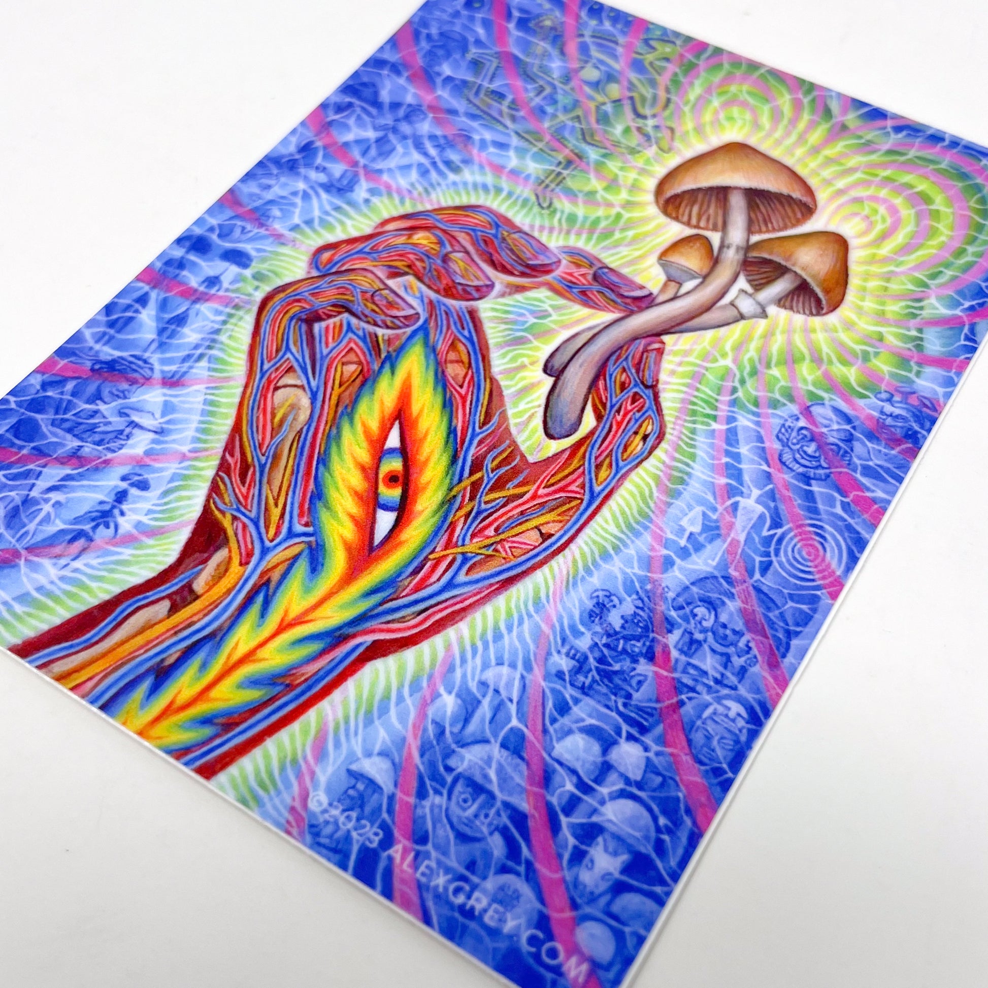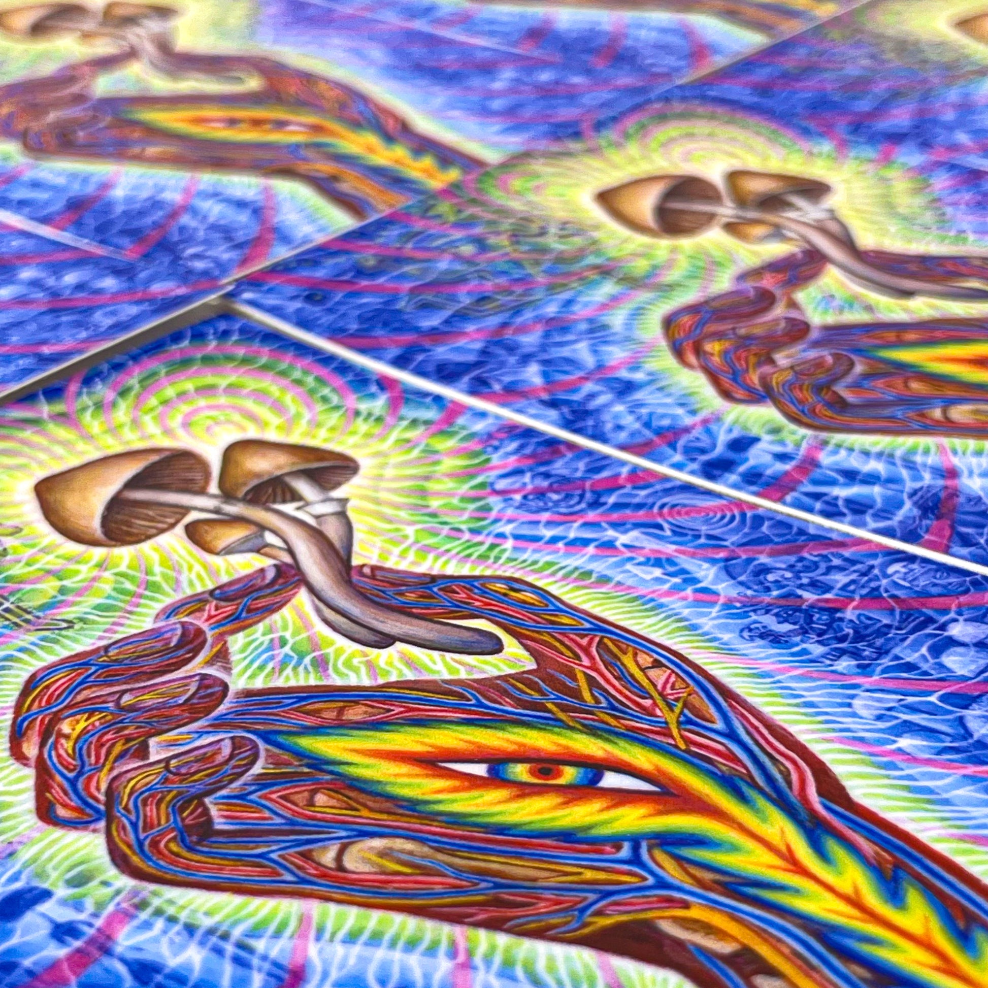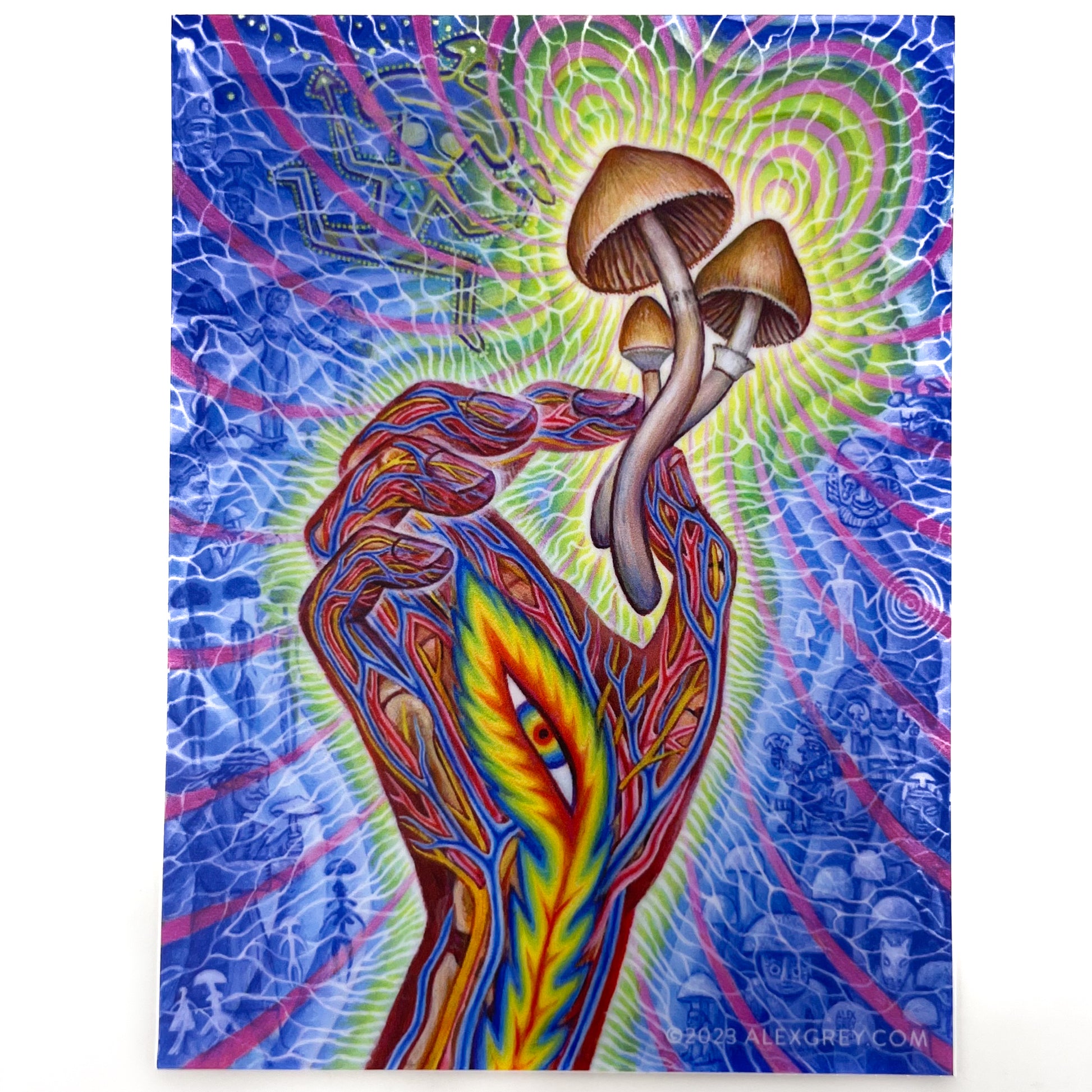 The secrets of spirituality are not only hidden in words, pictures or temples built by humans, but have been safely guarded by sacred plants for millennia. The term “flesh of the Gods" is a translation of Teonanacatl, the Mexican term for psilocybin mushrooms and describes the magic of the psychedelic state. Eat and become mystically united with infinite Divine Intelligence, only to be ingested in the most sacred way. The ancient shamanic and religious use of plant sacraments is now being recognized as foundational to religion, art and philosophy. In my painting the hand holds a few consciousness altering fungi as selected scenes from art history highlight mushroom visionary culture. On the left side of the hand an Egyptian bust of Osiris may show a mushroom cap, a Hindu deity sprouts a mushroom head, an 8,000 year old Tasilli cave art mushroom headed running figure carries mushrooms, a French depiction of Adam & Eve munching mushrooms, the Greek Goddess Demeter holding a mushroom, mushroom headed beings from Spanish cave art, and a figure bestowing a mushroom during a Zoroastrian Soma ceremony from a 2000 year old burial shroud found on the Silk Road. On the right side of the flaming eye hand are references to the mushroom showing art from Hawaian, Peruvian, Guatemalan, Mexican and Native American sources. The ubiquitous presence and use of magic mushrooms from around the world revealed by ancient art, shows humanity’s long, deep and ongoing connection with Great Spirit through psychedelic sacrament.