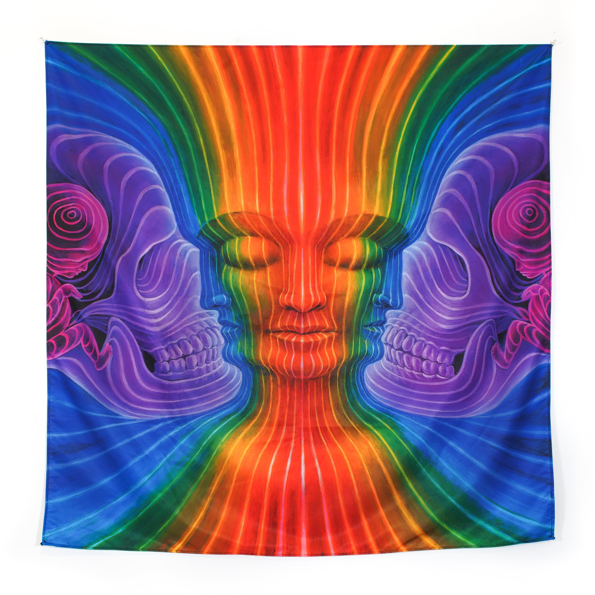 The central head, formed of rainbow energy, represents timeless infinite awareness. The skull/fetus, bracketing the "eternal one" portrays linear time, and indicates the impermanence of life. We are confronted by the constraints of time, yet every moment of "now" offers the opportunity to realize our timeless essence.