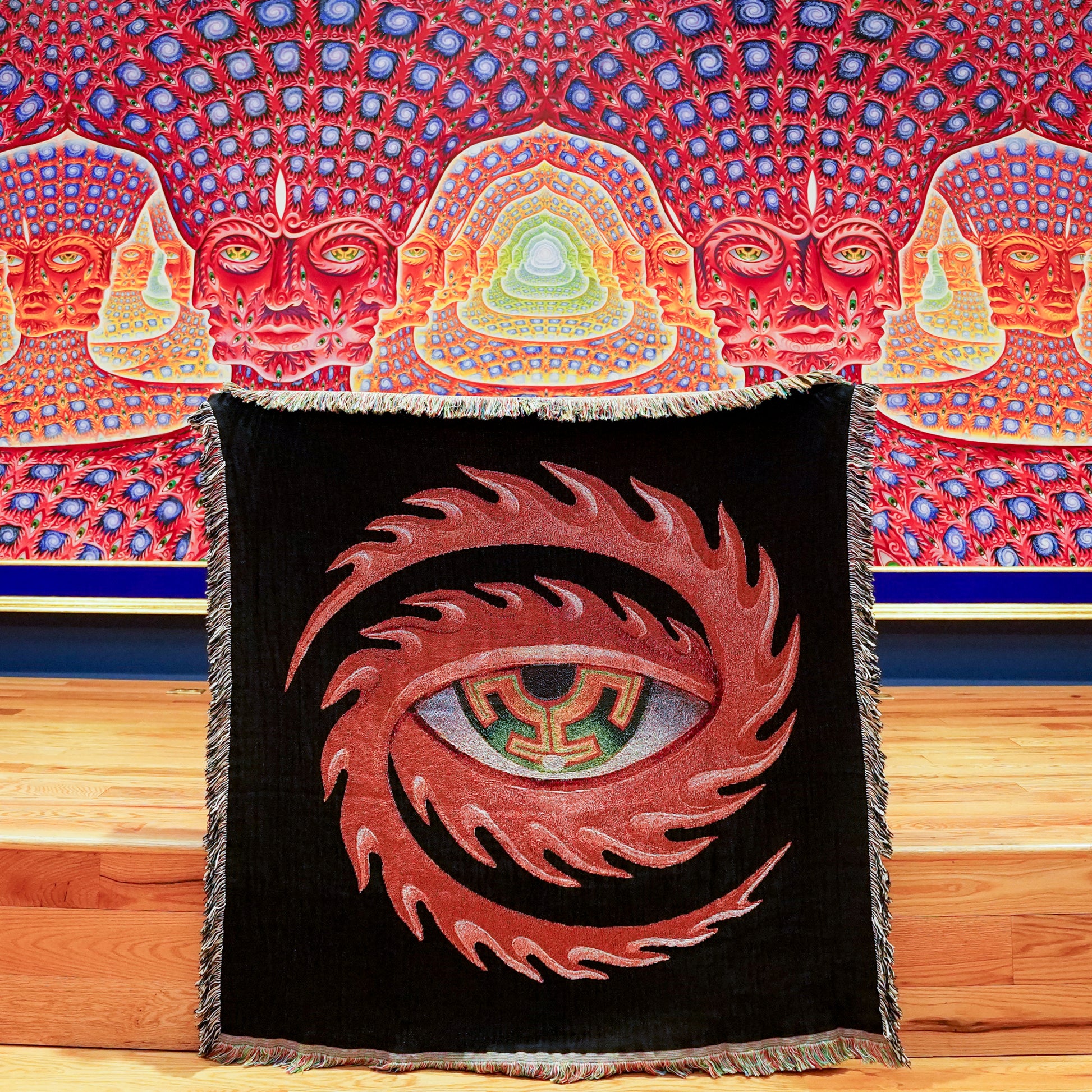 This design is derived from the eyes of the God Heads in the Net of Being painting by Alex Grey. The spiral flaming eye represents the powerful fire of potentiality surrounding each of the infinite perspectives of the Divine.