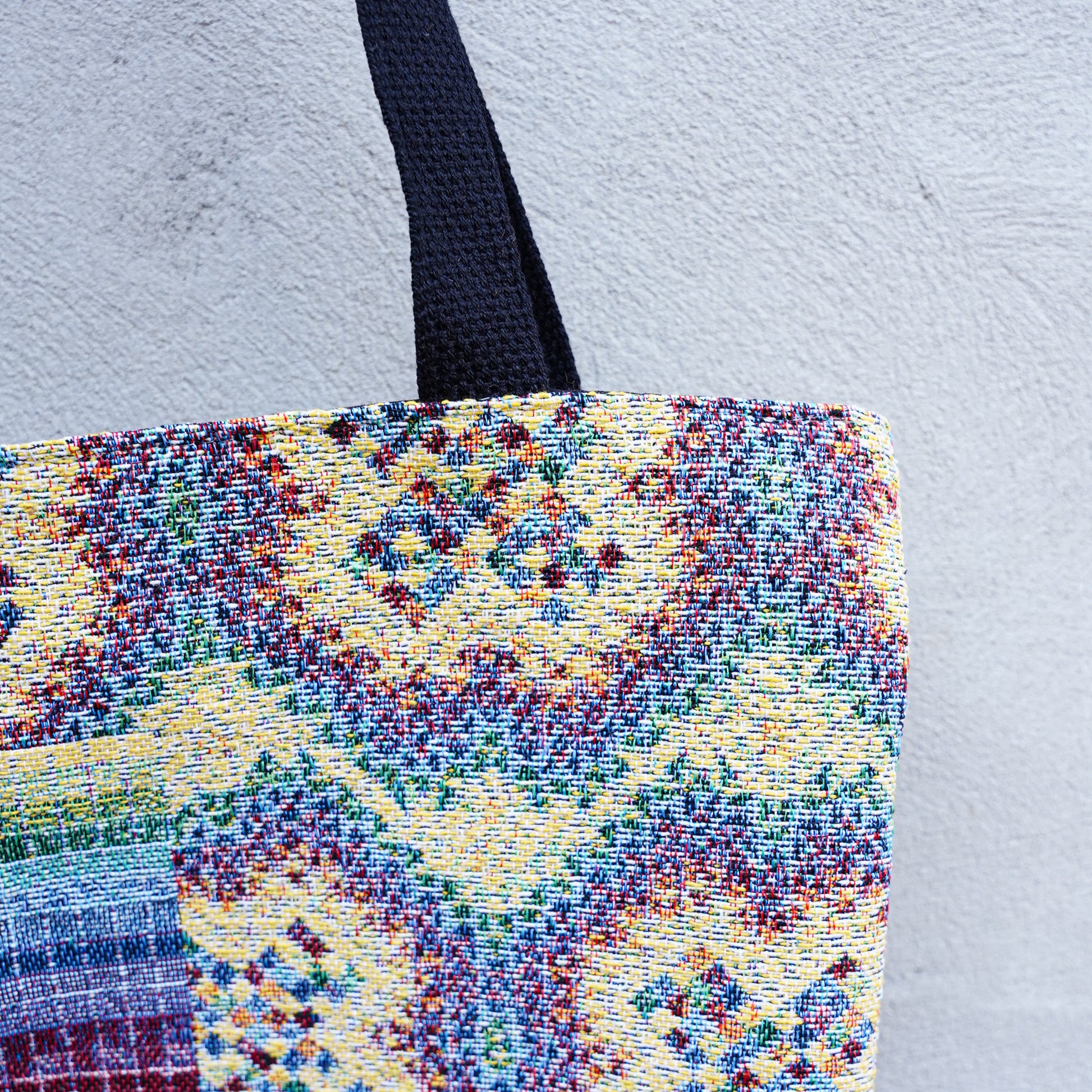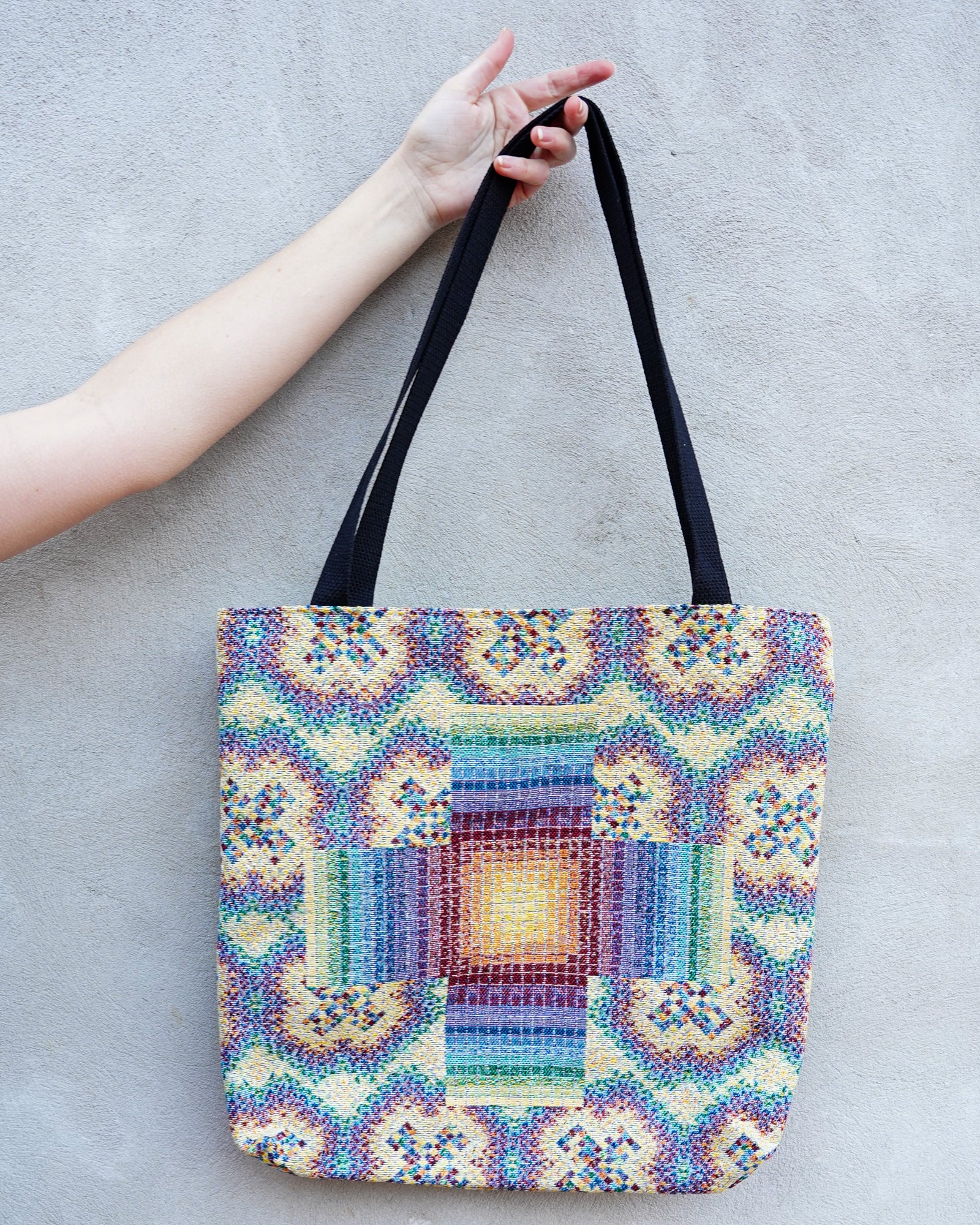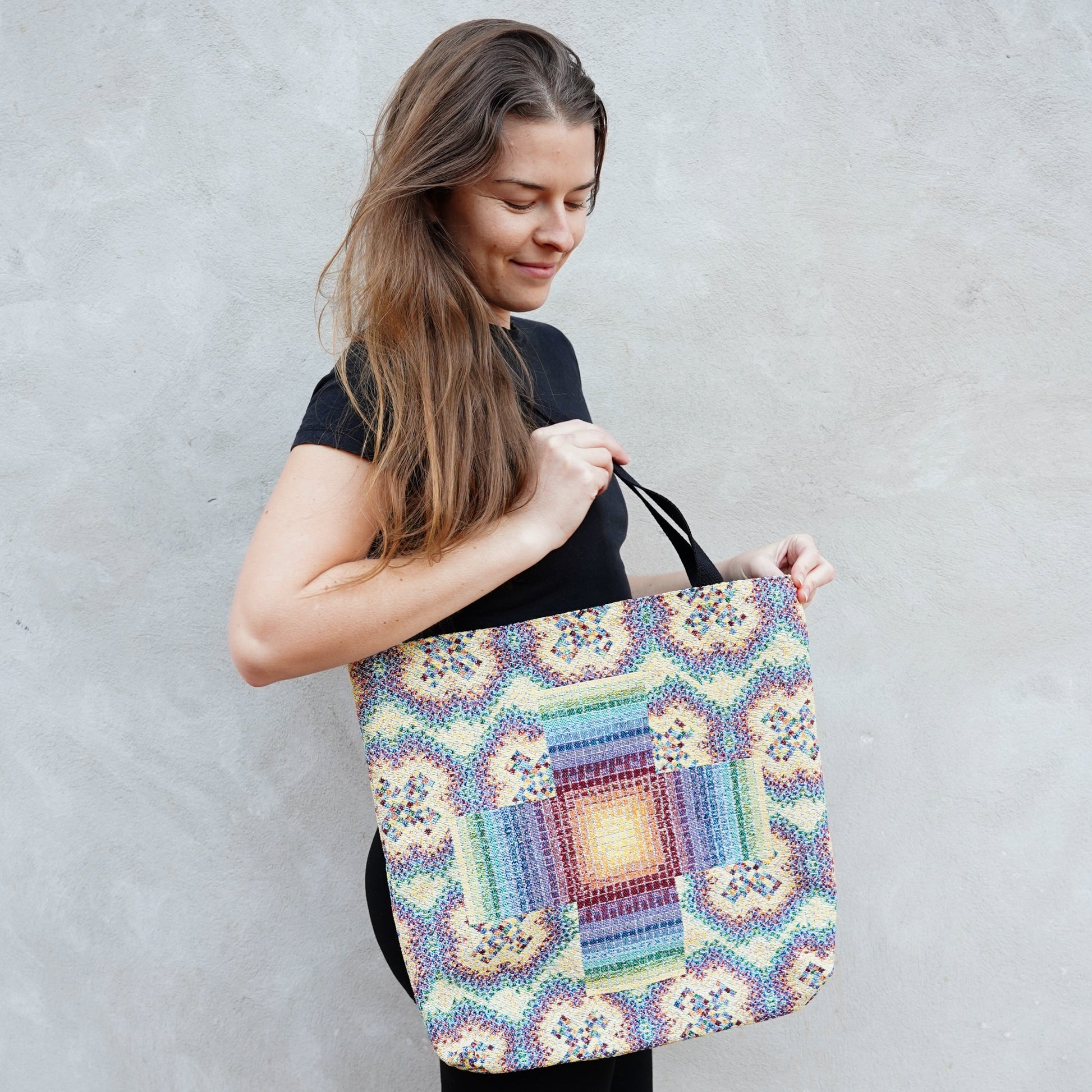 This museum quality tote is made in the USA from 100% cotton, with a fully woven tapestry exterior featuring the original artwork, Rainbow Cross by Allyson Grey on both sides, with a black cotton canvas interior.