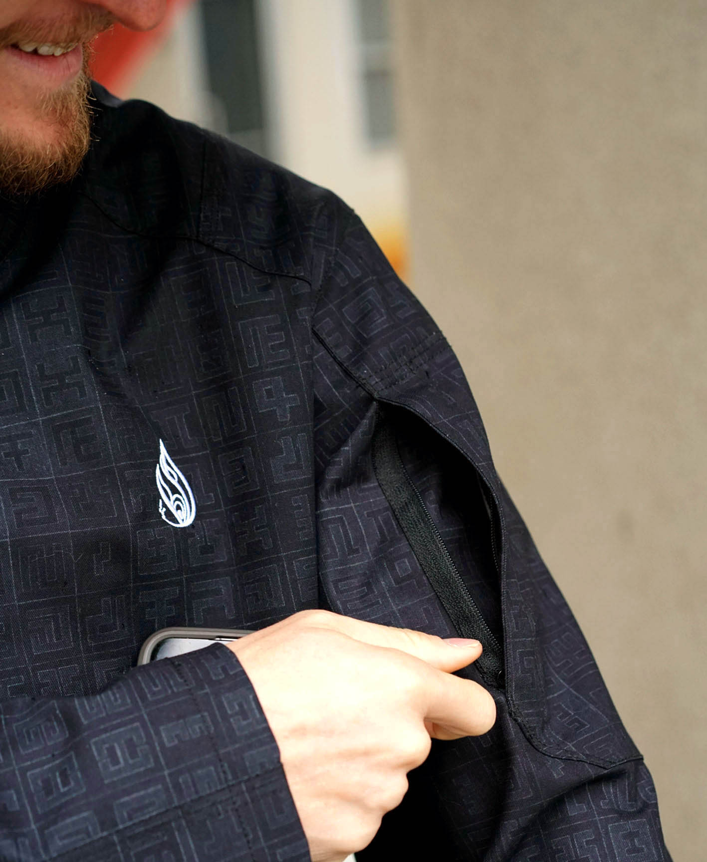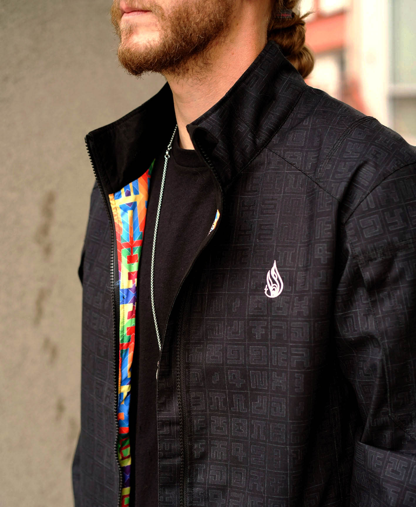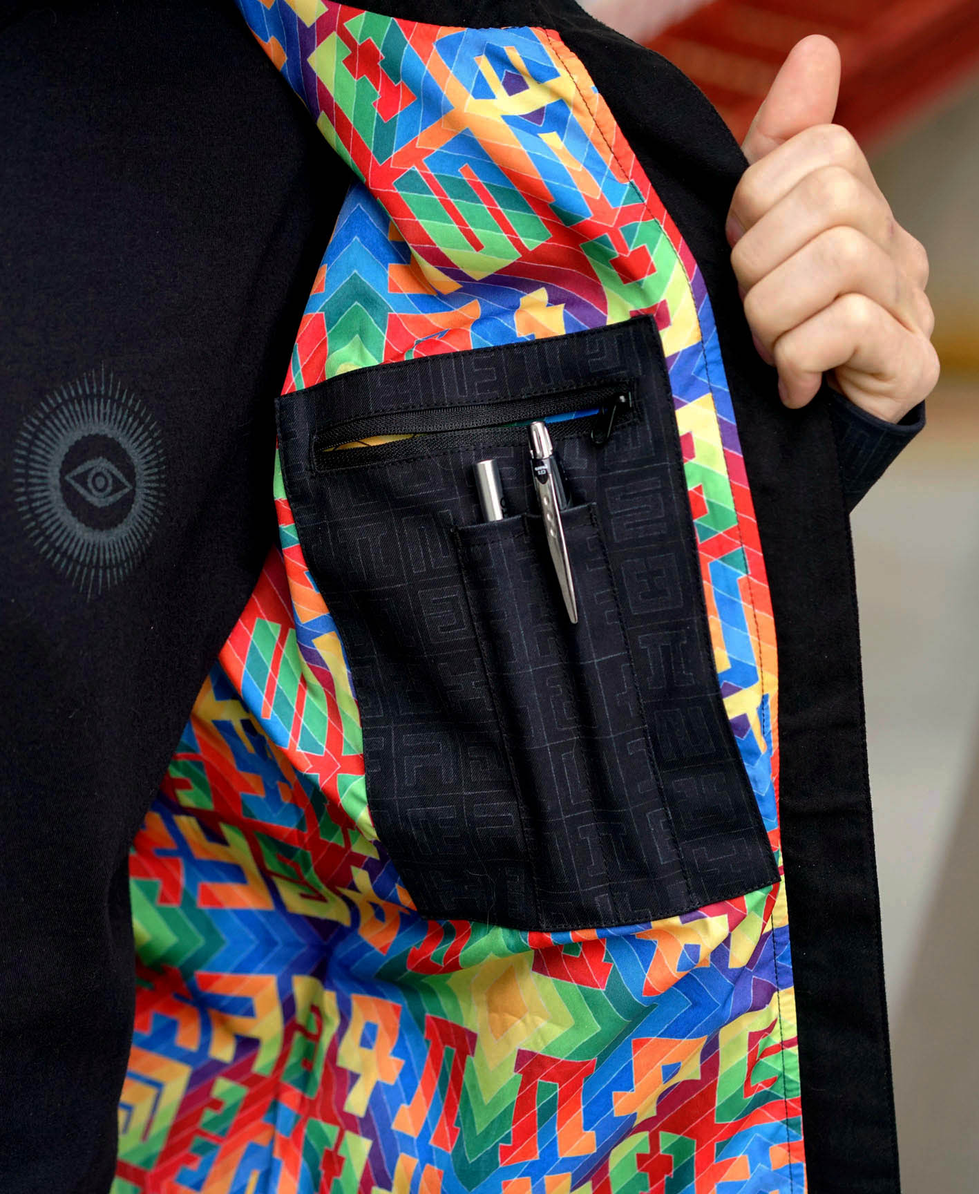 A perfect blend of functionality and expression - this jacket will keep you warm and dry while subtly showing your artistic side. Although it's hard to see any at all from the outside, there are 14 pockets. The weather resistant outer shell features sleek stitching and details. The real art experience happens inside the jacket, with our silky smooth liner sublimated fabric featuring Spectral Diamond Pinstripes by Allyson Grey
