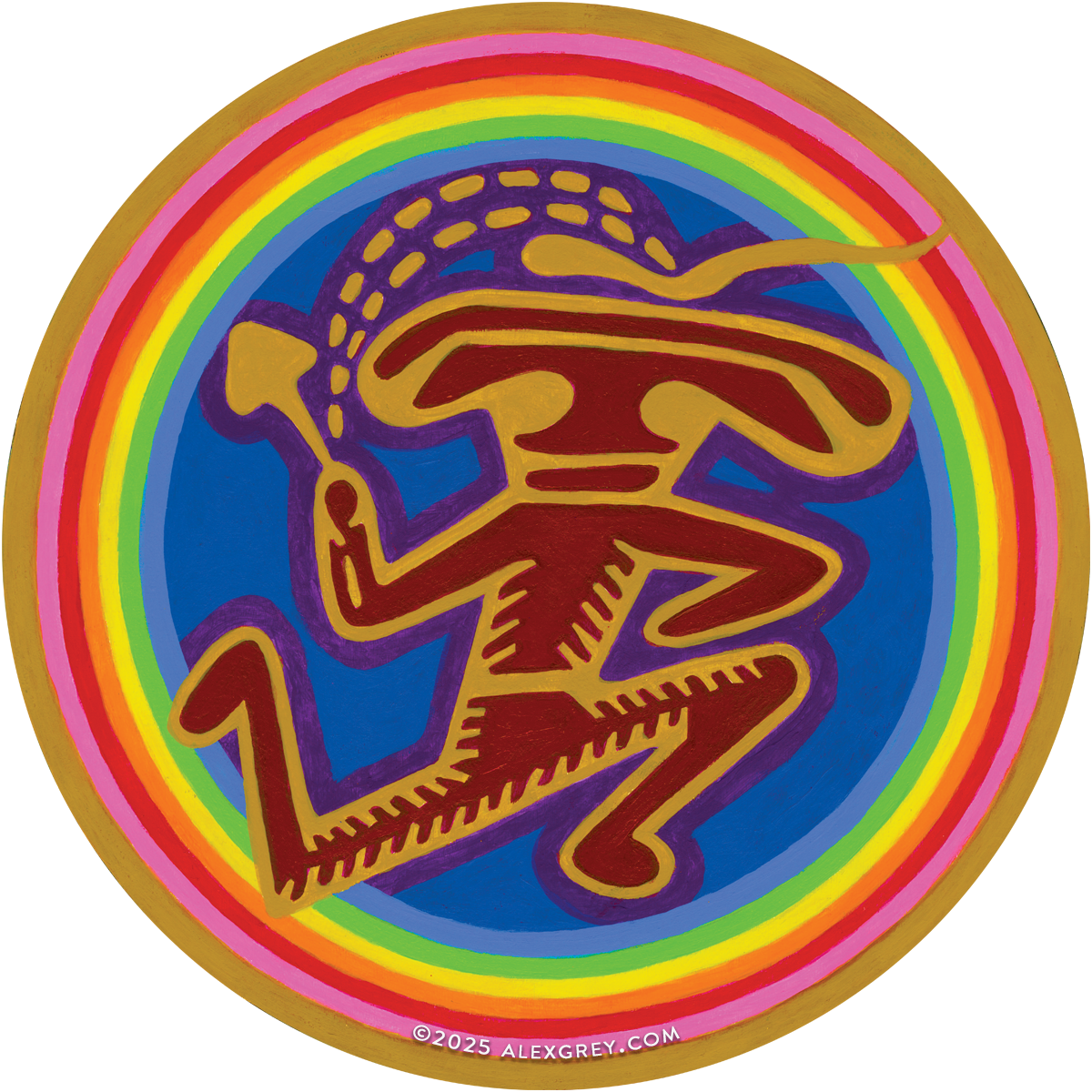 Psychedelic mushrooms may have stimulated both the visual cortex and the desire of early humanity to make art. In the Tassili Caves of Algeria are the earliest known representations (12,000 - 9,000 BC) of Human Mushroom fusions, as a group of mushroom-headed beings holding mushrooms scamper across the cave walls on dotted hills. I first remember seeing them in Terence McKenna’s book, “Food of the Gods” as graphics that Kathleen Harrison had prepared. I recently painted a rainbowed emblem based on the Tassili mushroom runners as a study for murals in the Psychedelic Reliquary of Entheon.